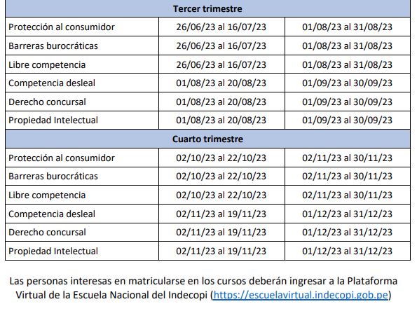 A lo largo de este 2023, se brindarán los siguientes cursos de manera virtual a través de la Escuela Virtual de Indecopi.