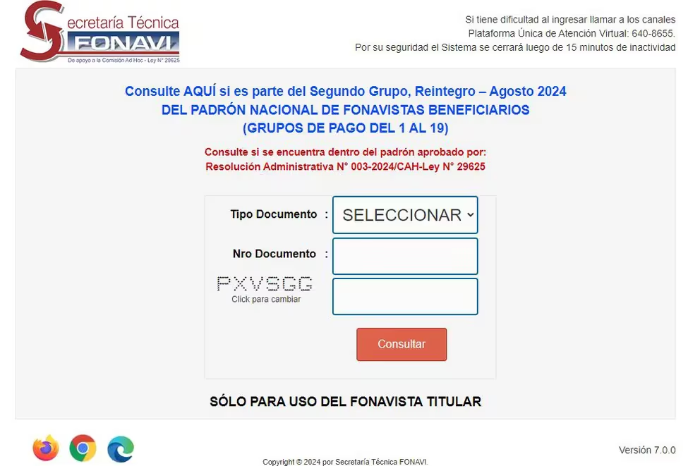 El primer paso es que se ingrese vía virtual al LINK del padrón de Reintegro 2: https://www.fonavi-st.gob.pe/sifonavic2/index.html Una vez allí, la persona debe colocar el número de su DNI para conocer si su nombre aparece dentro de la relación que podrá acceder a su dinero. La plataforma es gestionada por la Secretaría Técnica del Fonavi.