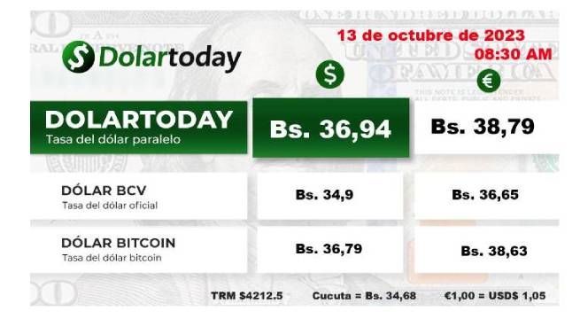 El valor del dólar fue actualizado en 34,90 bolívares para hoy, viernes 13 de octubre de 2023, según el Banco Central de Venezuela. Si deseas conocer el tipo de cambio paralelo puedes revisar los sitios web como Dolartoday o Monitor Dólar. Estos son establecidos en función a la oferta y demanda de bolívares en las principales ciudades de Venezuela.