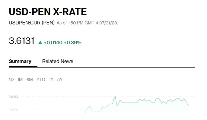 Hoy, lunes 31 de julio, el tipo de cambio en Perú comenzó con un leve incremento, alcanzando S/3,6000, según informó Bloomberg. Lo cual refleja un avance del 0,08% en comparación con el cierre de la sesión anterior, el jueves 27 de julio, cuando el Banco Central de Reserva del Perú (BCRP) informó que el tipo de cambio se ubicaba en S/3,5970.