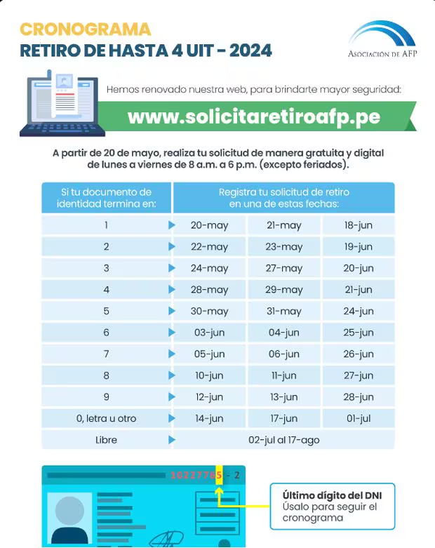 Para comenzar el procedimiento, el afiliado tiene que ingresar, en la fecha señalada en el gráfico (compartido a continuación) a www.solicitaretiroafp.pe, de lunes a viernes, de 8 a.m. a 6 p.m. No se considerará los feriados.