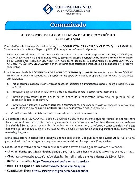 La Superintendencia de Banca, Seguros y AFP (SBS) ha intervenido la Cooperativa de Ahorro y Crédito Quillabamba debido a la “pérdida total de capital social y la reserva cooperativa”.