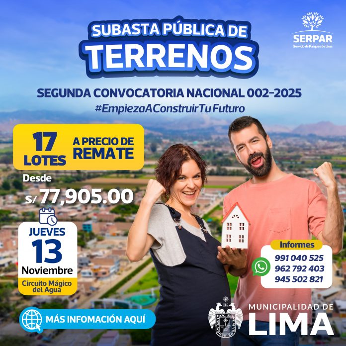 El Servicio de Parques de Lima (Serpar) anunció la subasta pública “a precios de remate” de 17 terrenos ubicados en ocho distritos de la capital. Los lotes están debidamente saneados, inscritos en los Registros Públicos y cuentan con todos los servicios básicos.