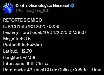 Temblor | HOY, sábado 12 de abril en Perú. Nuestro país está ubicado en la zona denominada Cinturón de Fuego del Pacífico, por ello, siempre se corre el riesgo de sufrir temblores y terremotos, ya que descansan sobre las placas tectónicas que siempre están en fricción. En esta nota de Latina Noticias, te mostramos cuándo, dónde y a qué hora fue el último sismo a nivel nacional.