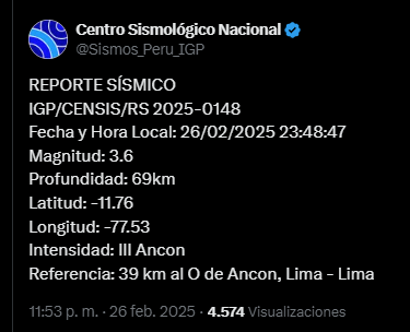 — Centro Sismológico Nacional (@Sismos_Peru_IGP) February 26, 2025