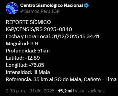 Referencia: 35 km al SO de Mala, Cañete – Lima— Centro Sismológico Nacional (@Sismos_Peru_IGP) December 31, 2025