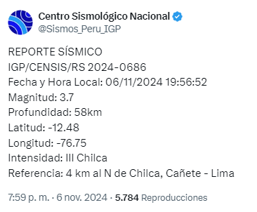 TEMBLOR HOY EN PERÚ, 6 DE NOVIEMBRE 2024
