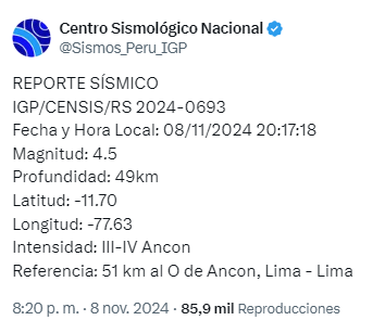 TEMBLOR HOY EN PERÚ, 8 DE NOVIEMBRE DEL 2024