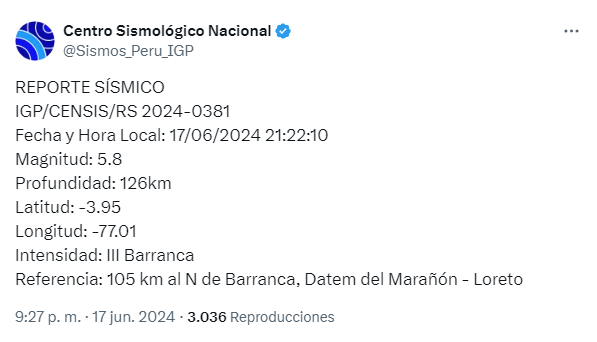 TEMBLOR HOY EN PERÚ, 17 DE JUNIO 2024