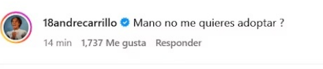La repercusión en redes sociales fue inmediata, pero uno de los comentarios que más risa generó fue el de André Carrillo. Con su característico humor, el futbolista comentó: “Mano, ¿no me quieres adoptar?”, desatando una ola de respuestas divertidas. Seguidores y amigos se unieron a la broma, expresando comentarios como “Adóptame a mí también”, “Que nos adopte a los dos” y Carrillo, si soy”.
