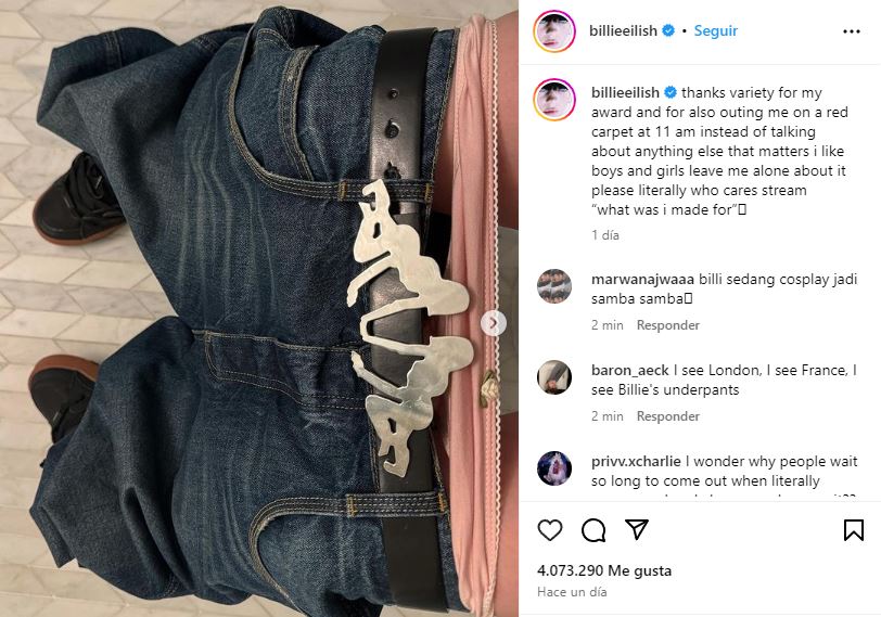 En una publicación en su cuenta de Instagram, la intérprete de “Bad Guy” señaló: “Gracias, ‘Variety’, por mi premio y también por ‘sacarme’ (del clóset) en una alfombra roja a las 11 a.m., en vez de hablar de cualquier otra cosa que importara”. Adjuntó a esta descripción un carrusel de imágenes en las que aparece en el baño y también en la misma ‘red carpet’.