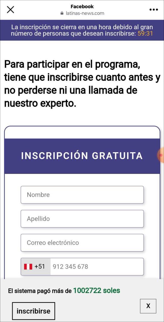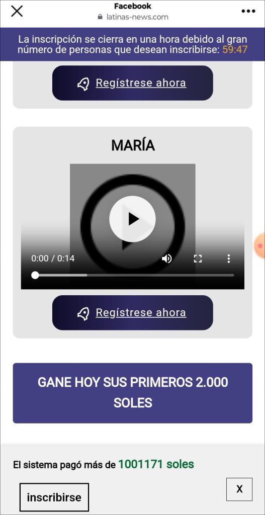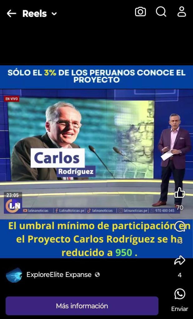 En la publicación ofrecen grandes ganancias a cambio de abrir una cuenta con un monto de 950 soles en una plataforma que simula ser la de Latina Noticias, pero que en realidad es un sitio web creado por ciberdelincuentes. Los usuarios deben estar atentos a esta publicidad engañosa y no darle clic al enlace que indican.