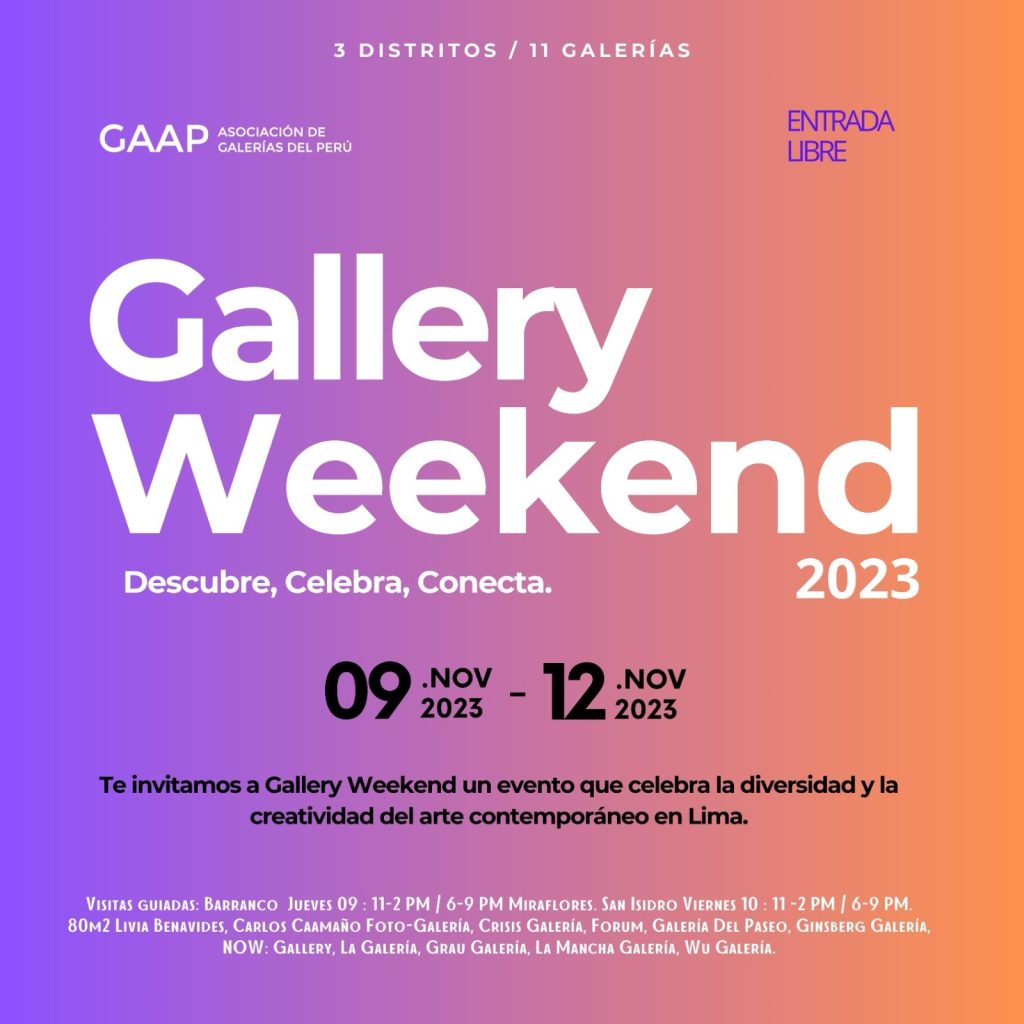 Del 9 al 12 de noviembre, nuestra capital se convertirá en un epicentro de la creatividad artística con la llegada de Gallery Weekend. El evento organizado por la Asociación de Galerías del Perú (GAAP) reunirá a galerías de arte contemporáneo de la ciudad, ofreciéndonos una gran variedad de obras.