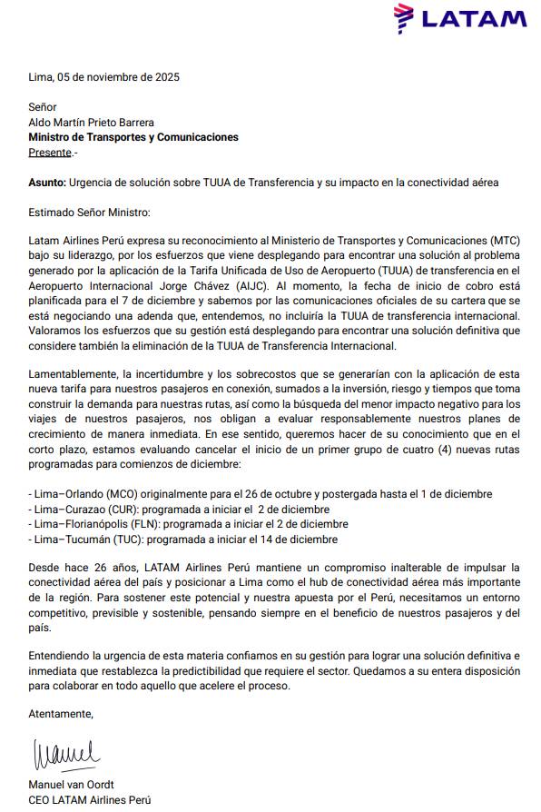 La empresa remitió una misiva formal al ministro de Transportes, Aldo Prieto, enfatizando la “urgencia de solución” ante el potencial perjuicio a la conectividad aérea del país. La falta de claridad sobre esta tarifa, cuya entrada en vigor está prevista para el 7 de diciembre, ha motivado a Latam a considerar la cancelación de cuatro servicios internacionales con origen en Lima.