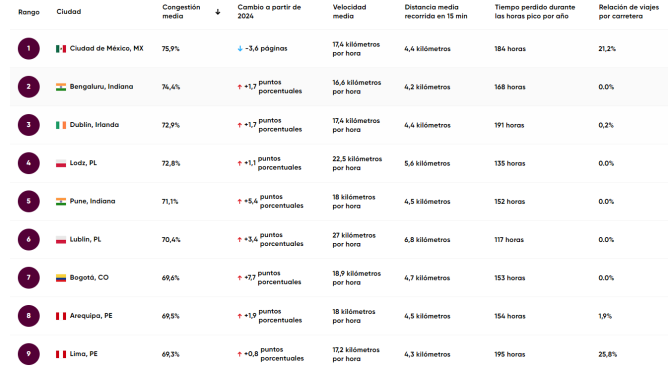 El ranking es liderado por Ciudad de México, seguida de ciudades como Bengaluru, Dublín y Bogotá. TomTom advierte que, sin mejoras en planificación vial y transporte sostenible, la congestión seguirá creciendo en las principales ciudades del país.