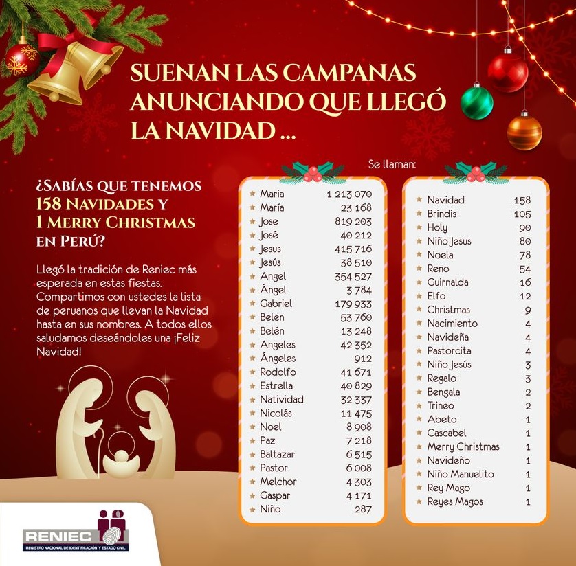 Se acerca la Navidad 2023 y, en esa línea, en Latina Noticias te contamos cuáles son los nombres más curiosos alusivos a esta festividad en el Perú. El Registro Nacional de Identificación y Estado Civil (Reniec) dio a conocer un listado con muchas sorpresas.