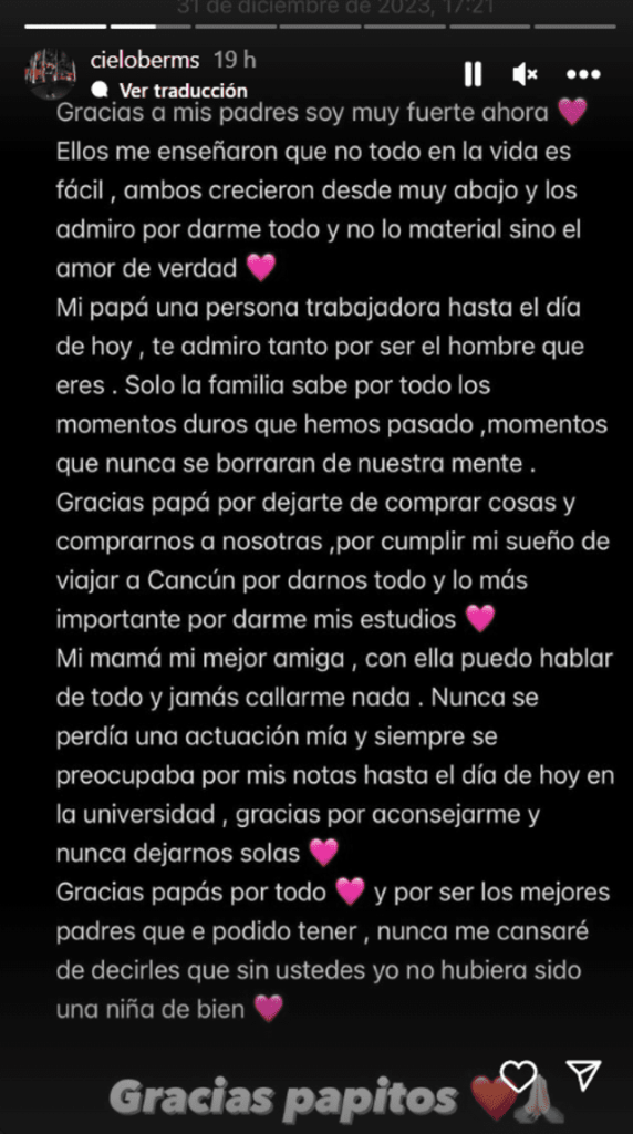 “Gracias a mis padres, soy muy fuerte ahora. Ellos me enseñaron que no todo en la vida es fácil, ambos crecieron desde muy abajo y los admiro por darme todo y no lo material, sino el amor de verdad. Mi papá, una persona trabajadora hasta el día de hoy, te admiro tanto por ser el hombre que eres. Solo la familia sabe por todos los momentos duros que hemos pasado. Momentos que nunca se borrarán de nuestra mente. Gracias, papá, por dejarte de comprar cosas y comprarnos a nosotras, por cumplir mi sueño de viajar a Cancún, por darnos todo y lo más importante, mis estudios”, manifestó.