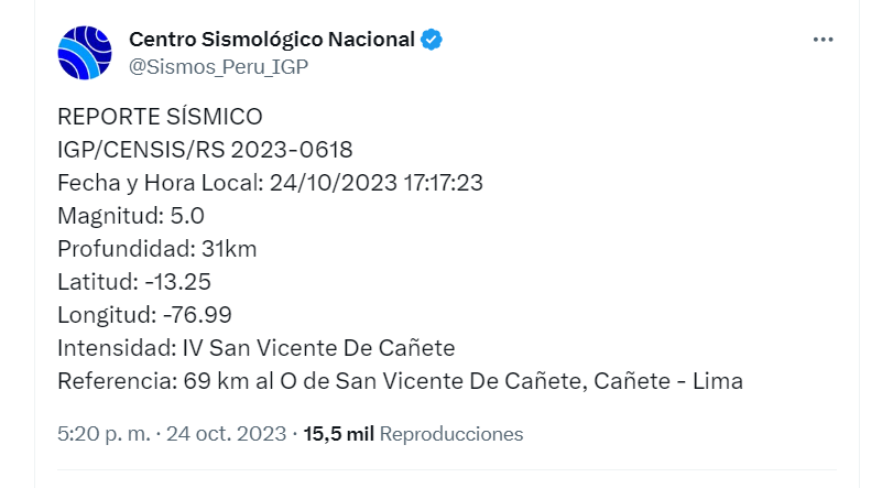 Este martes 24 de octubre se registró un sismo de magnitud 5.0 en el distrito de San Vicente de Cañete, provincia de Cañete, en la región Lima. De acuerdo con información del Instituto Geofísico del Perú (IGP), el movimiento sísmico se produjo a las 5:17 de la tarde.