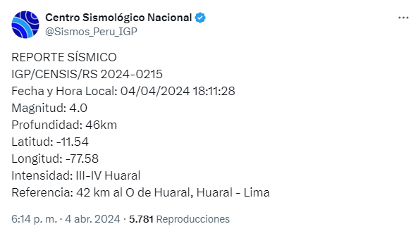 Temblor hoy en Perú, 4 de abril: horario, epicentro y magnitud del último sismo